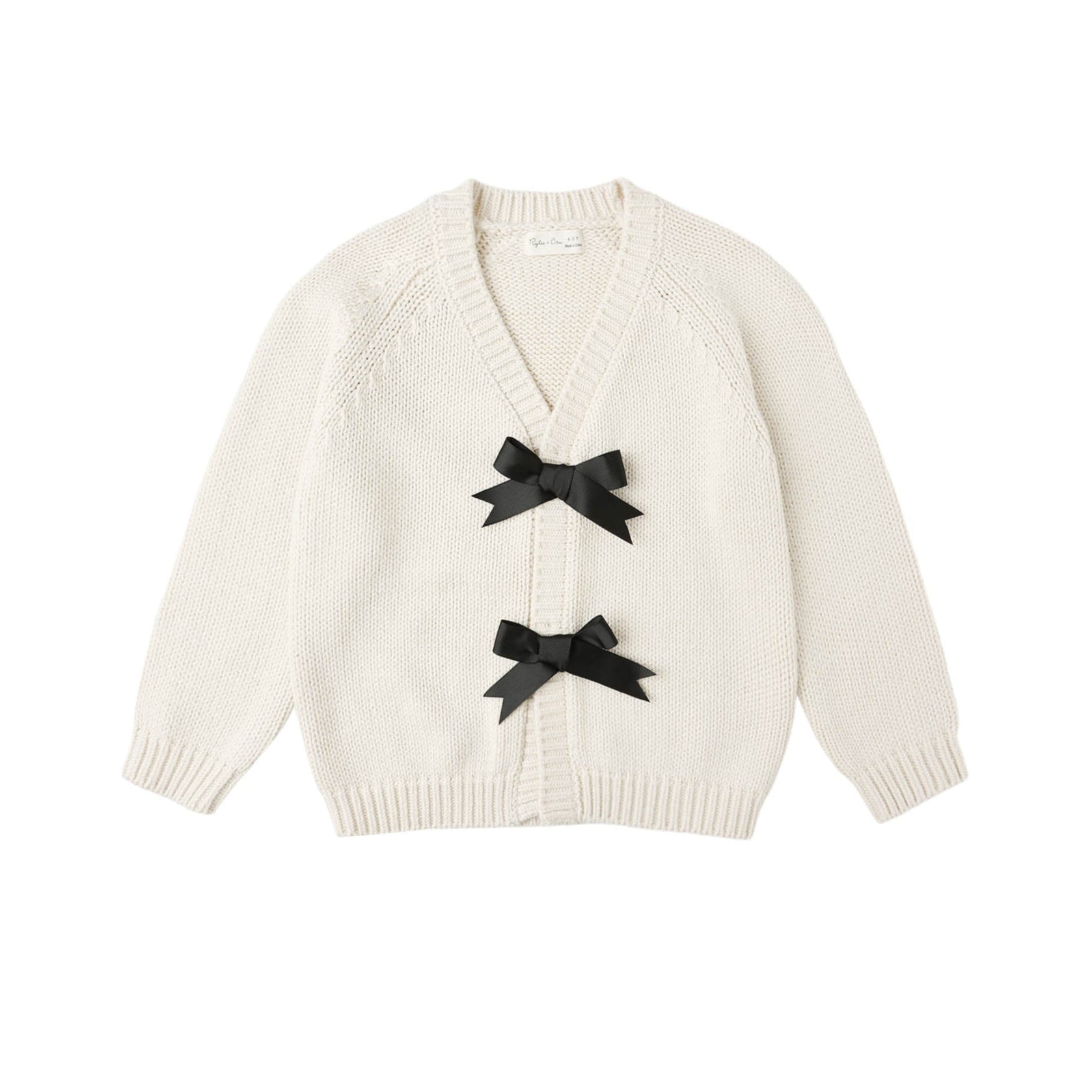 V-neck cardigan with relaxed raglan sleeves and a two-button placket accented by fixed bows for a sweet, gentle touch. Featuring our 'natural' hue.
