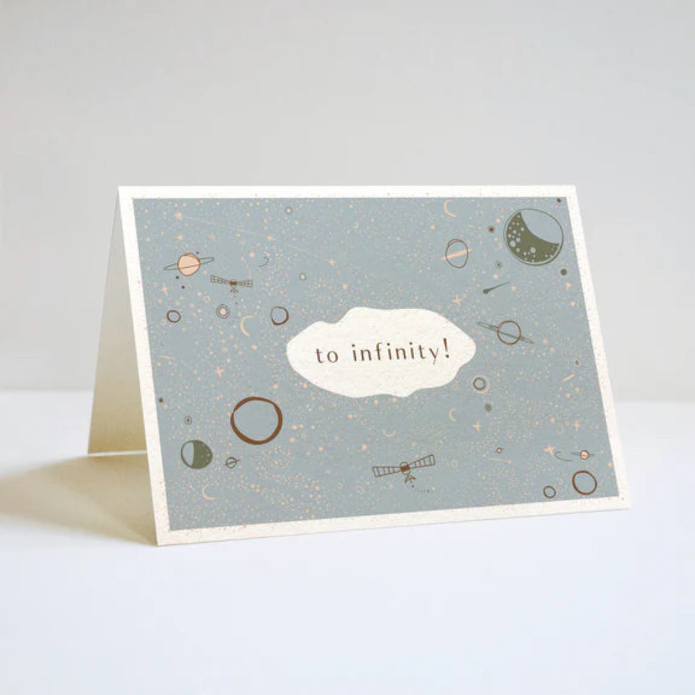 Celebrate the wonder of both our littlest AND biggest explorers with these hand-drawn cards inspired by infinity and beyond! Printed on plush cotton paper these cards are pure luxury and style. The blank interior encourages infinite travel into your own imagination!