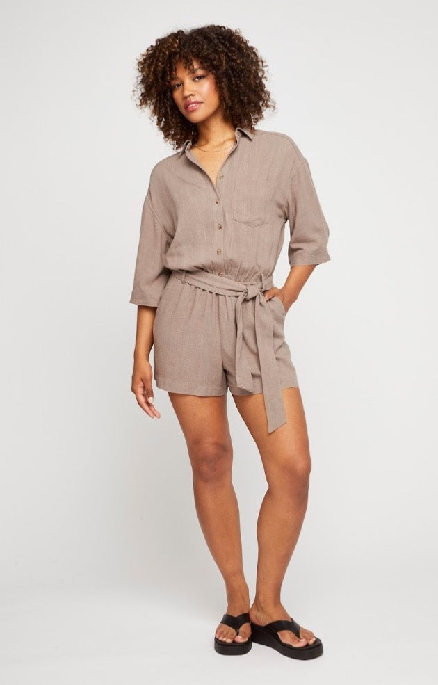 The Charlotte romper is made of a linen blend that is perfect for warm weather. Features include an elasticated waistband, removable belt, slash pockets and a functional button front closure.