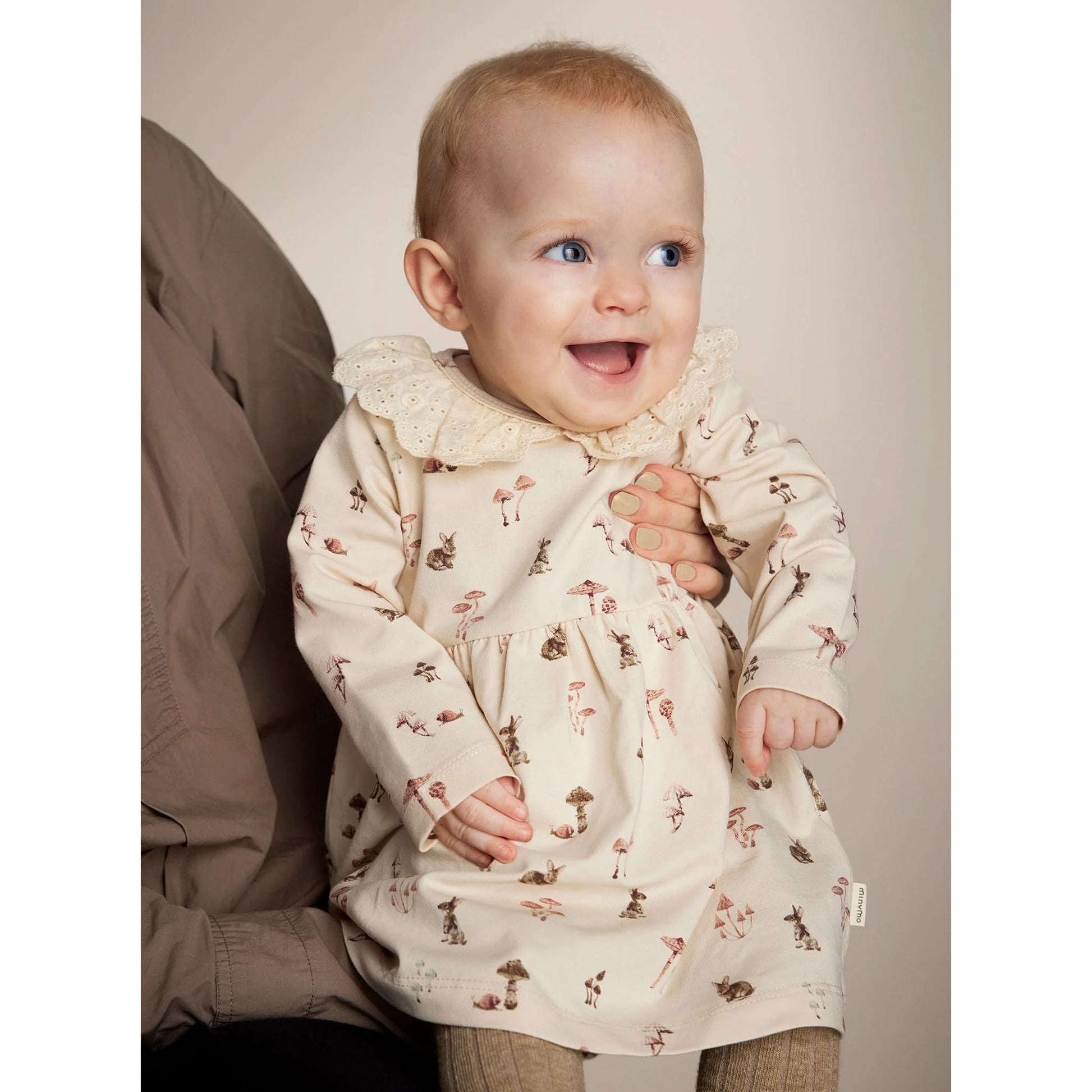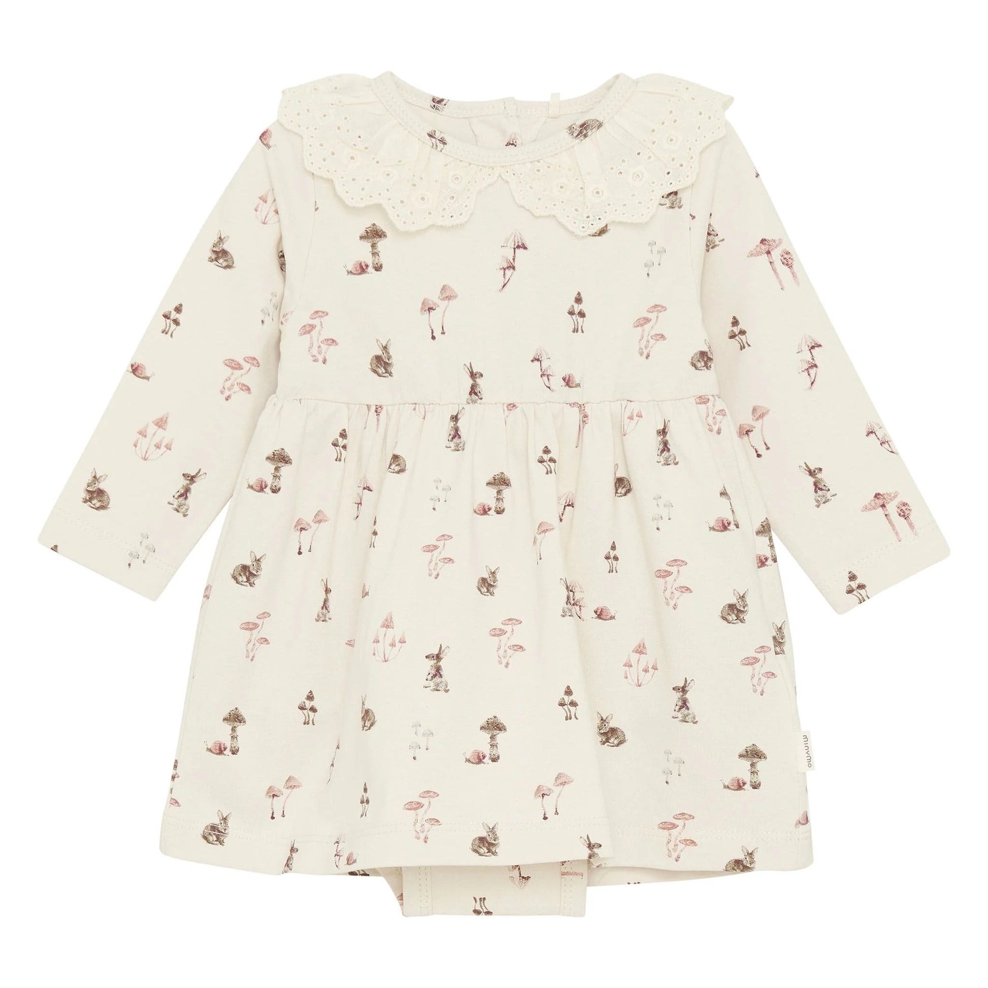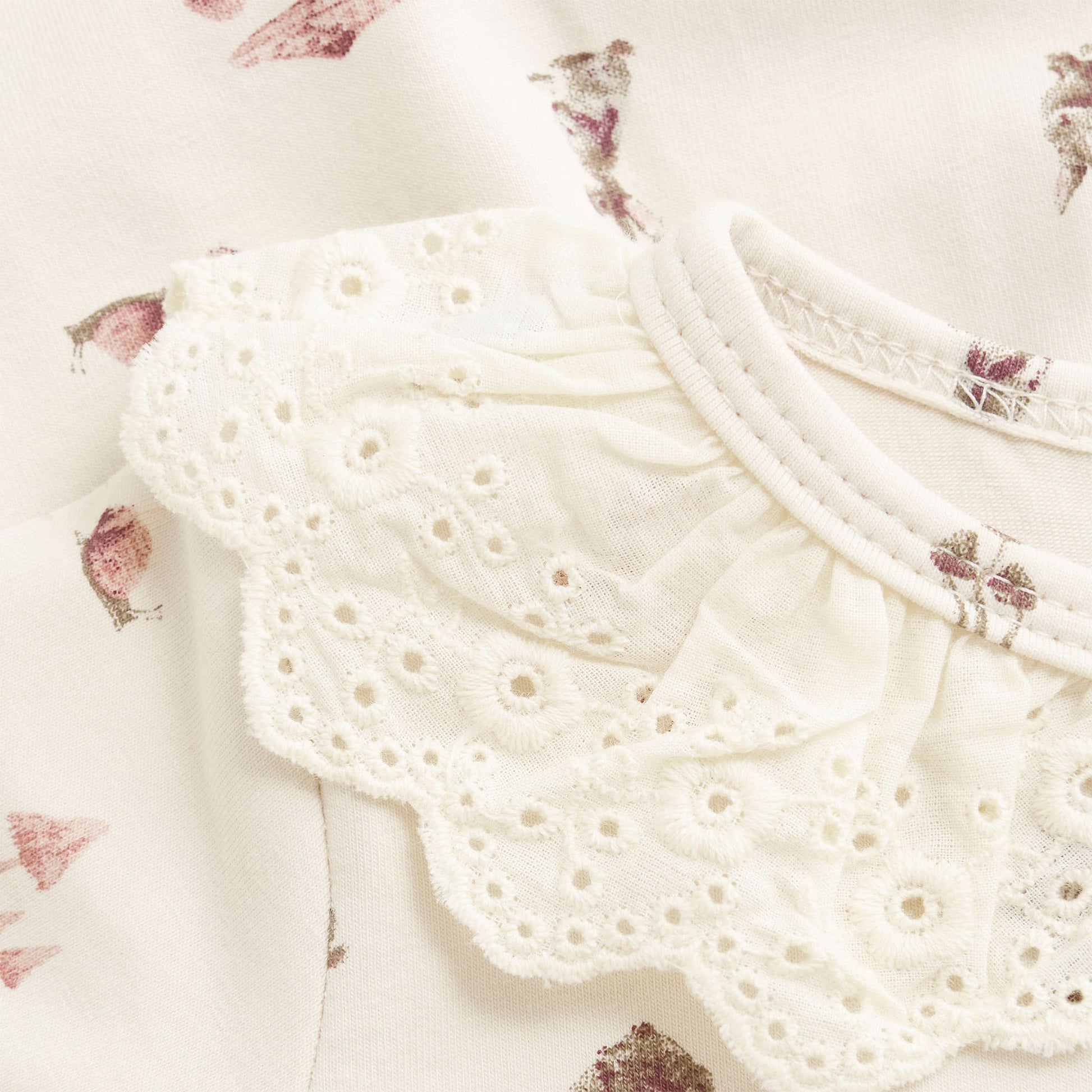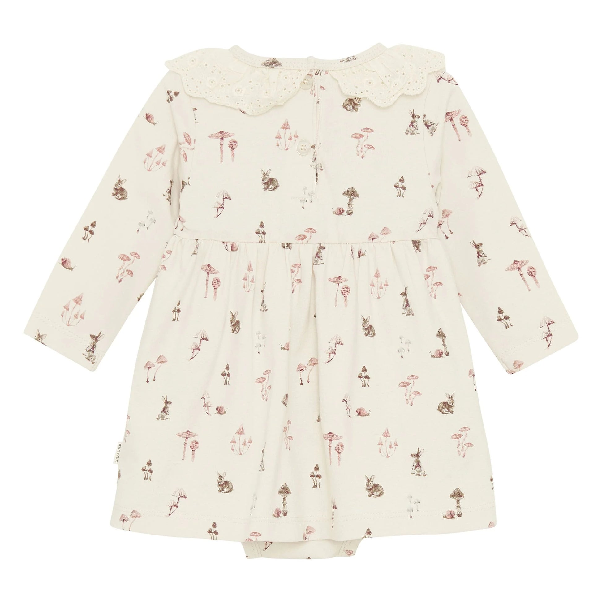 Easy and adorable one-piece outfit features a sweet mushroom and rabbit print with an eyelet-detailed collar.