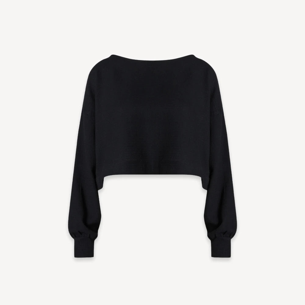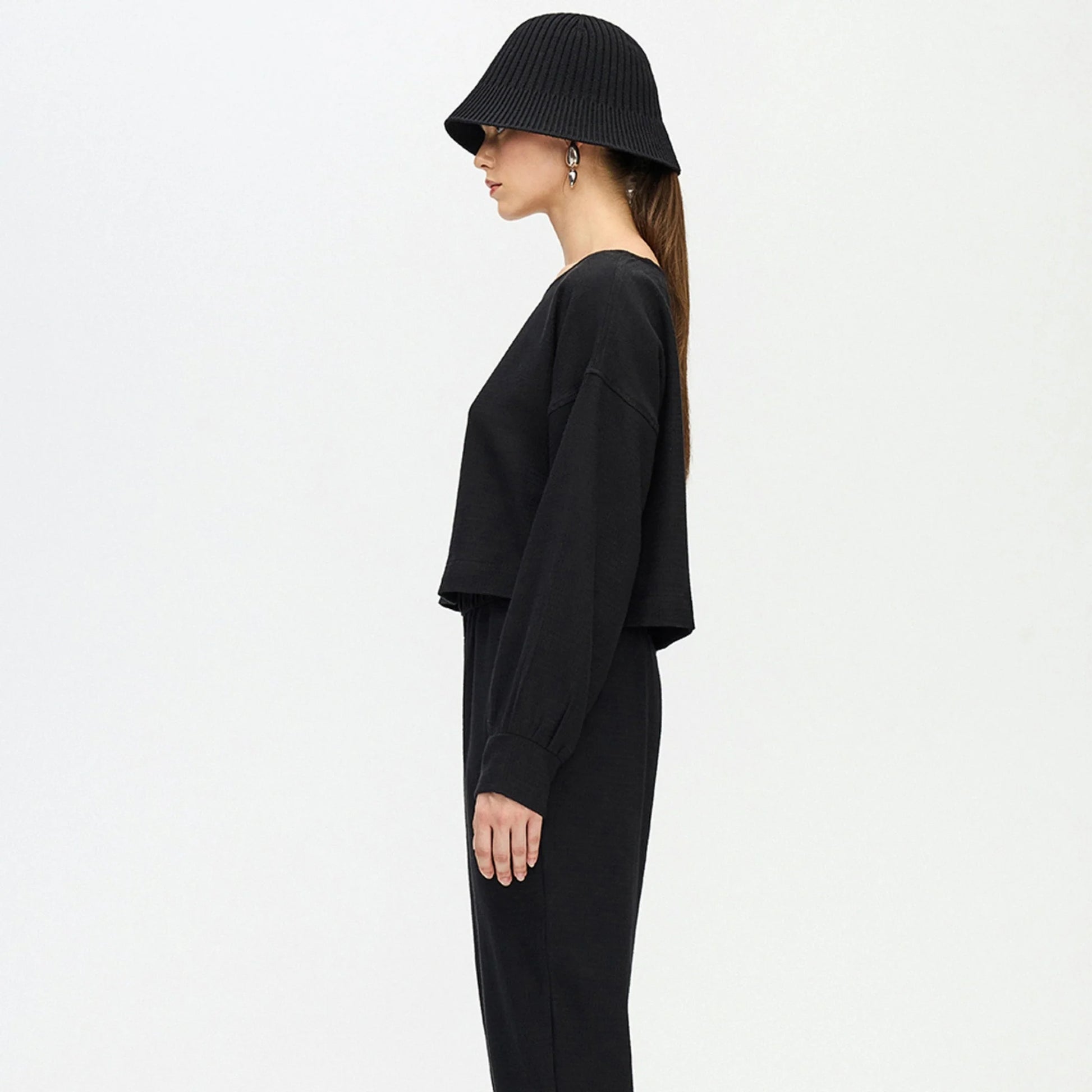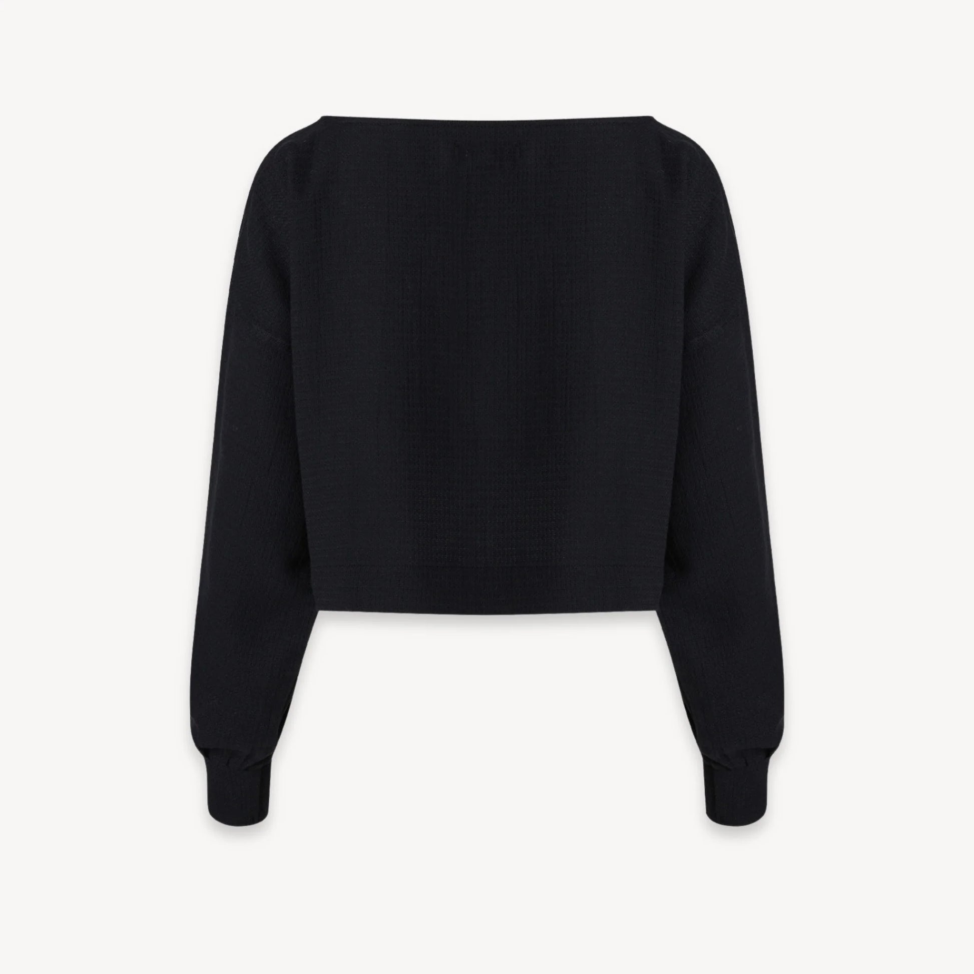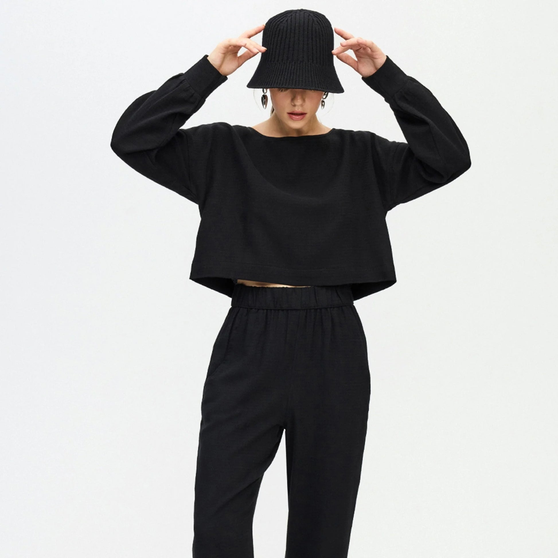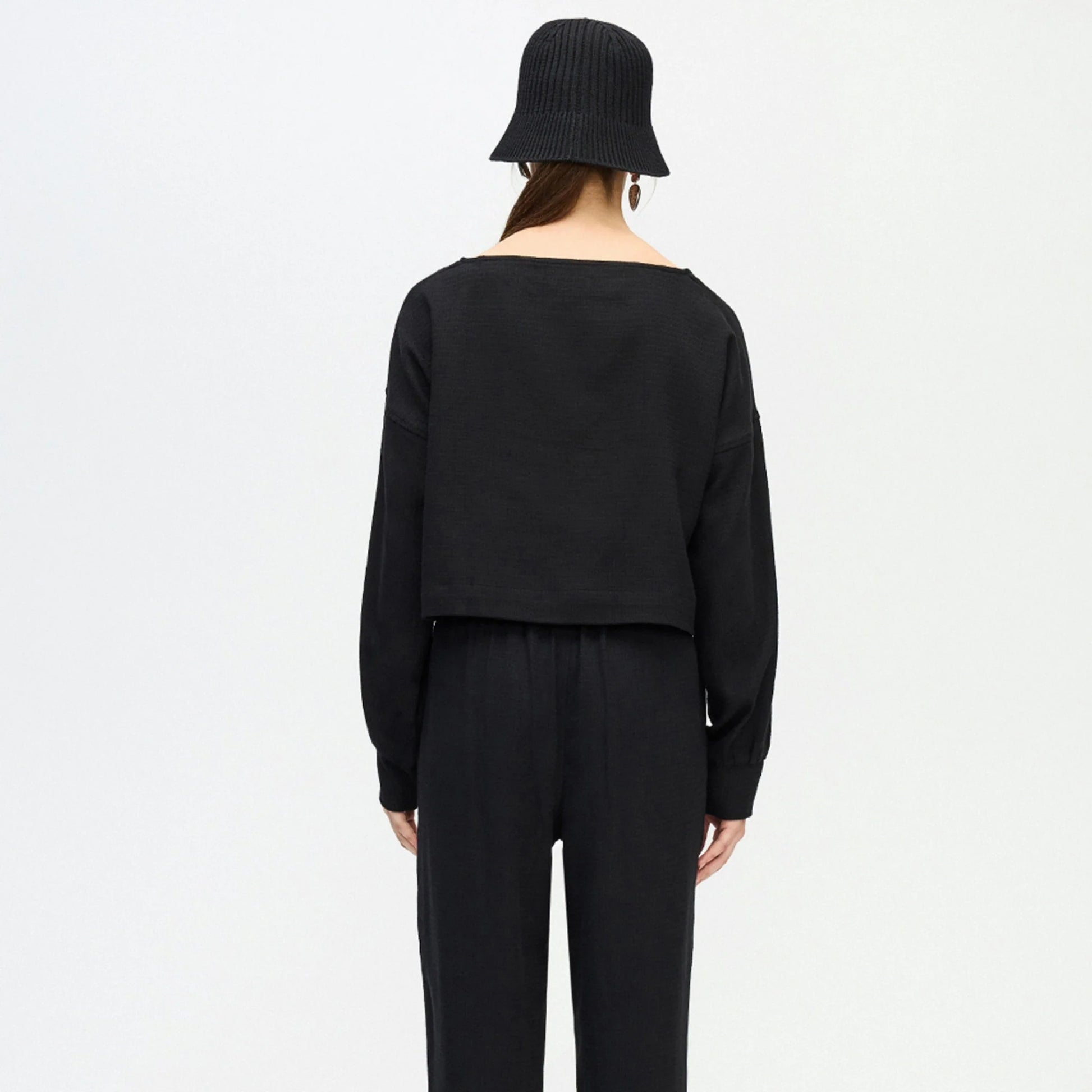 The Flat Black Crop Blouse is a long cuffed style sleeve, with a boat neckline and cropped top length. Pair with the Flat Black Slouchy Pants for a full outfit.