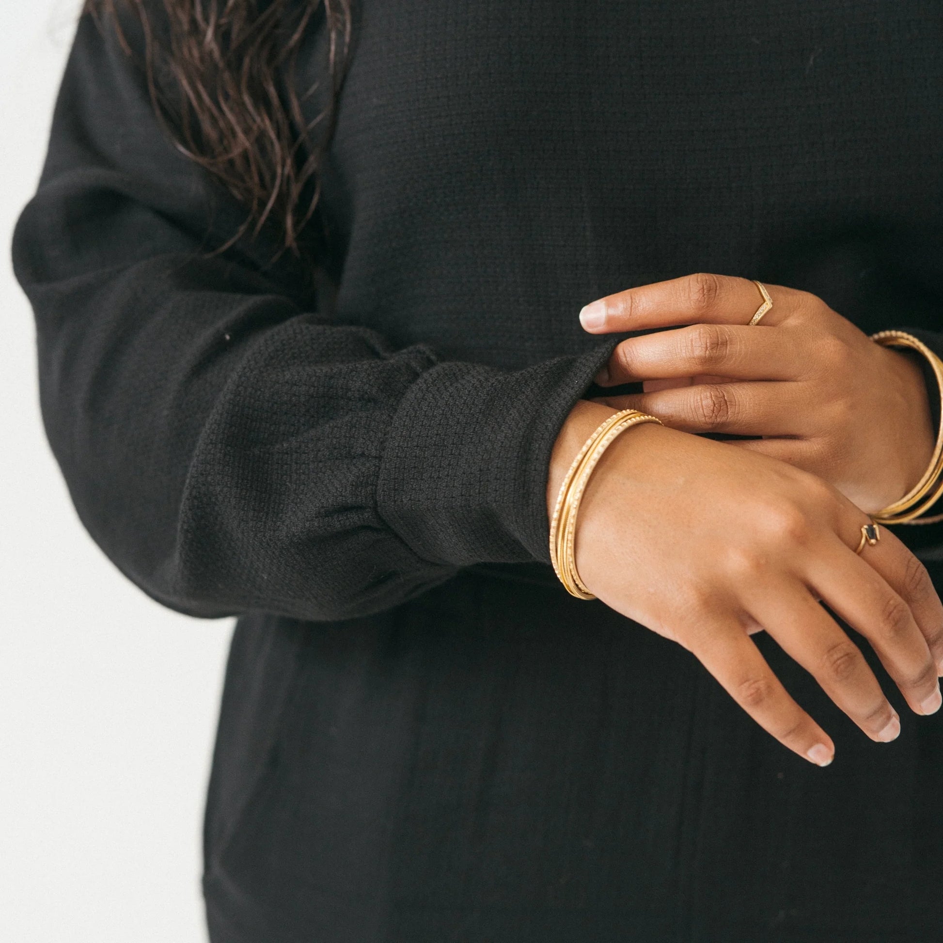The Flat Black Collection is made with yarn-dyed, 100% Turkish Cotton. Yarn-dyed fabrics are resistant to color fading, making these pieces look new and last in your wardrobe for longer. The interweaving of the yarns creates texture and depth and feel luxuriously soft.