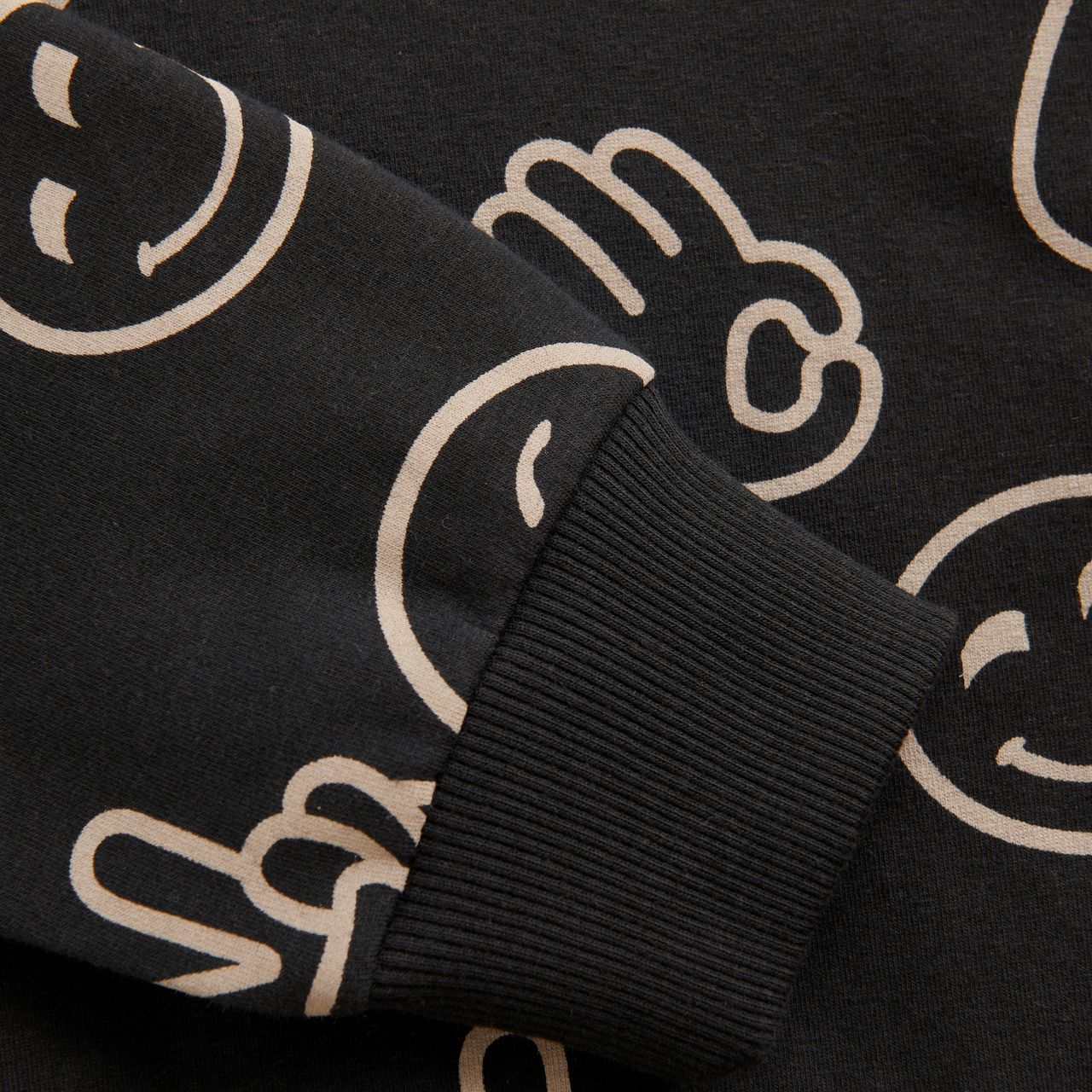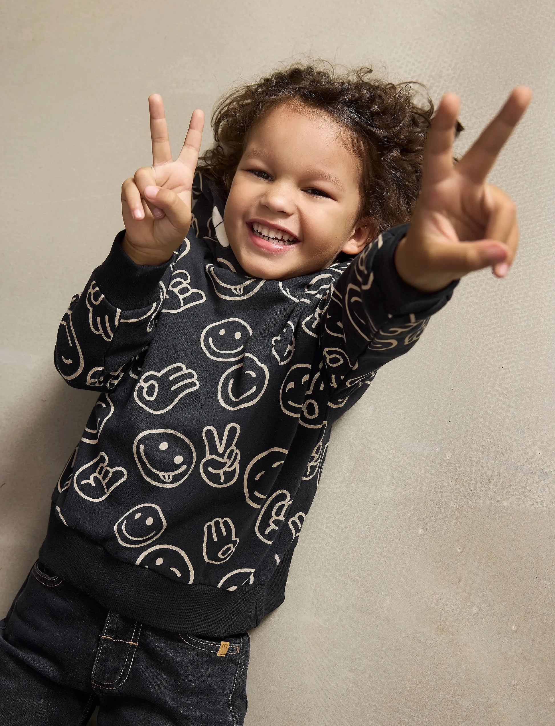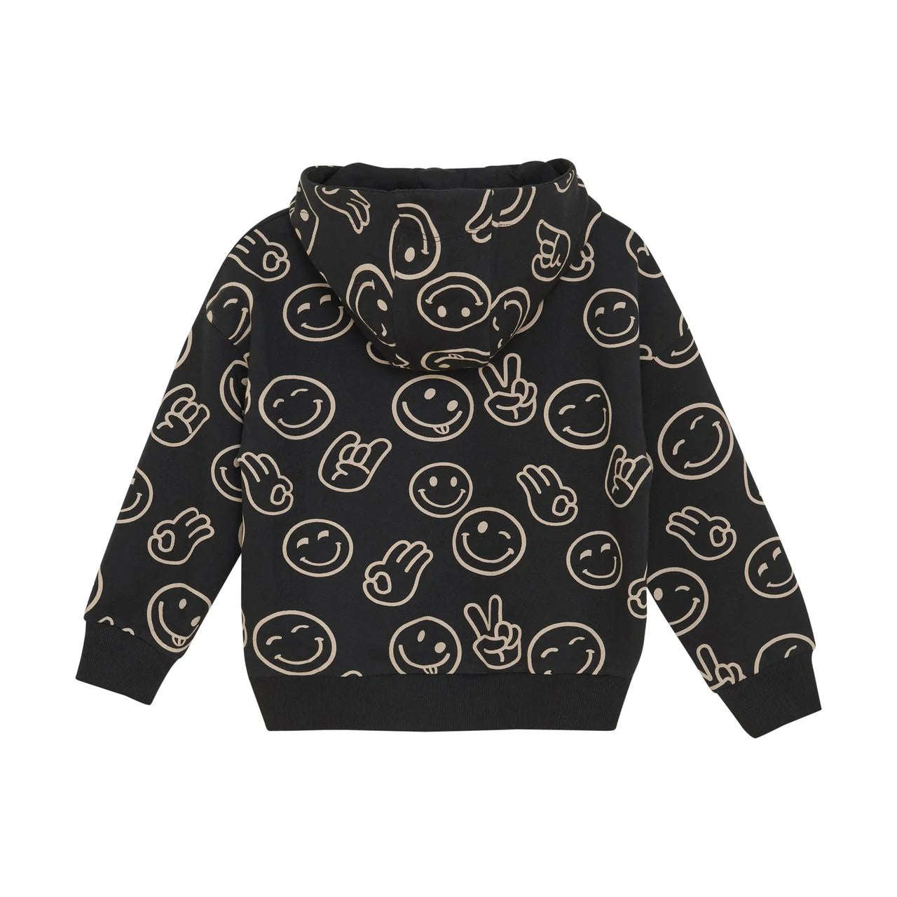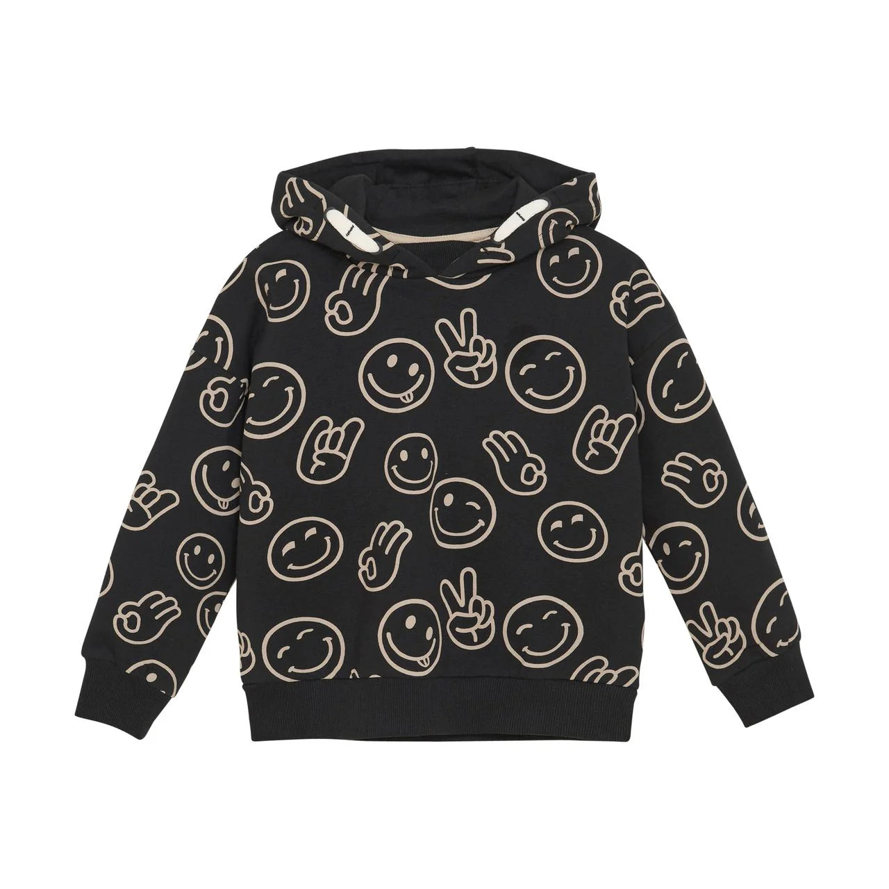 Brighten your day with the Minymo Emoji Hooded Sweatshirt in Tap Shoe! This lightweight French Terry sweatshirt features cheerful all-over emoji print that adds a playful touch to any outfit. Perfect for cozy comfort with a fun, uplifting vibe.