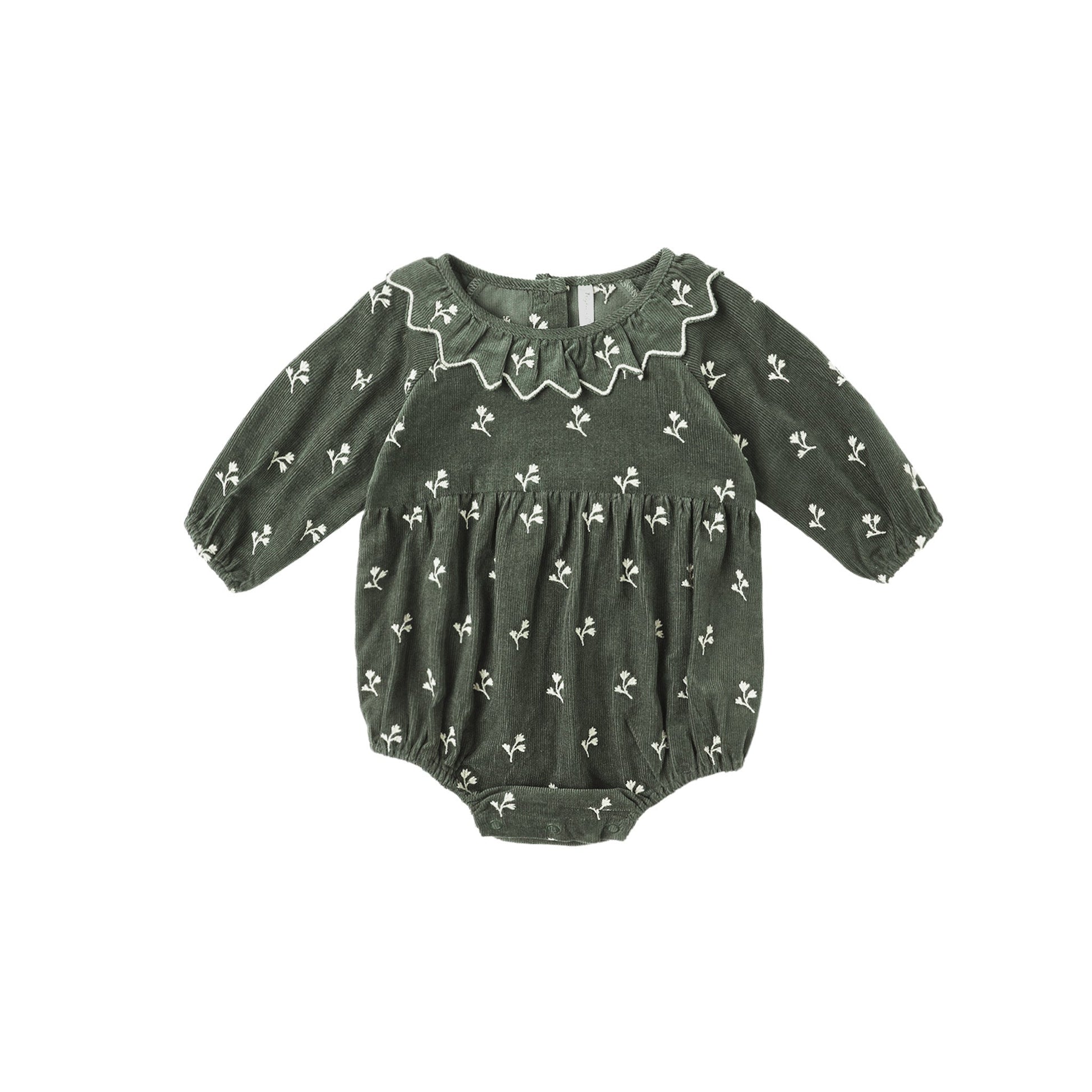 The Freya romper features a gathering on the bubbled body, leg openings, and sleeves, plus a ruffled collar and button backing.