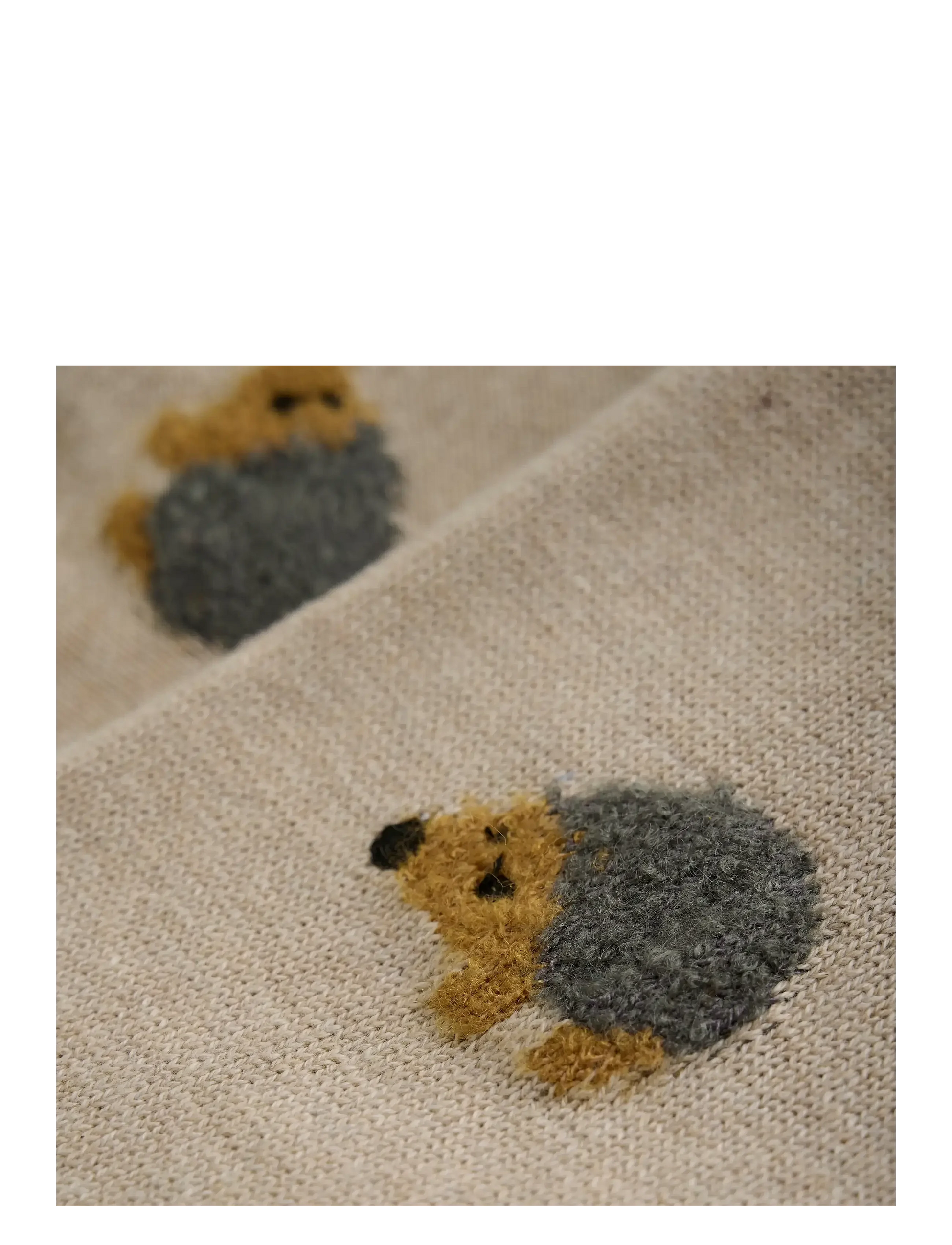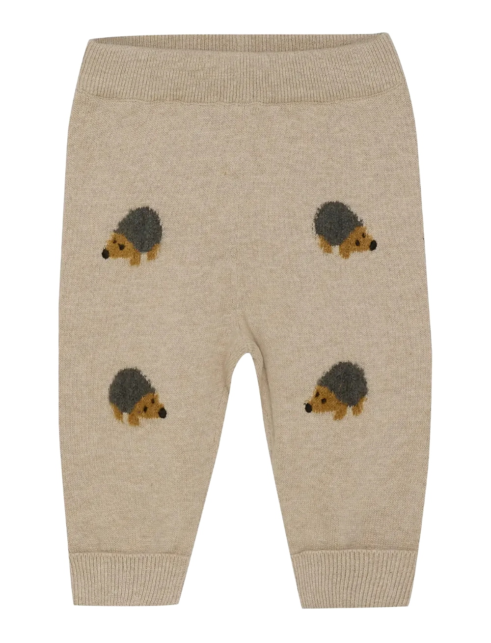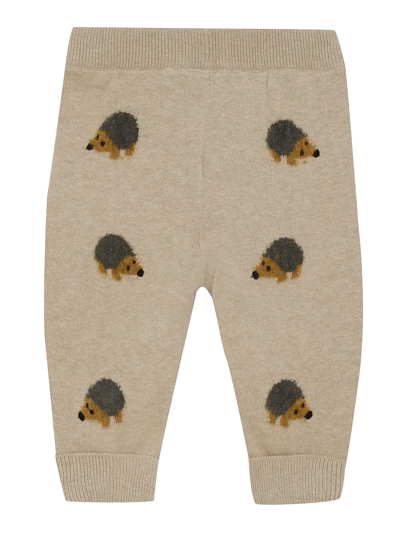 Knitted pants with a cute hedgehog print and wide ribbed edges, ensuring a great fit and stylish design.