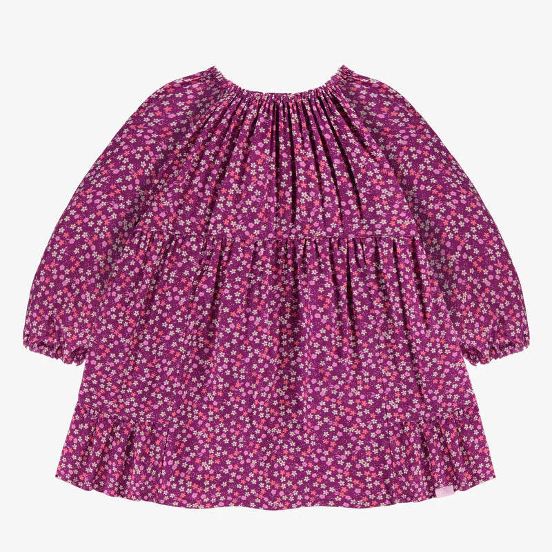 This dress with a floral pattern, features an elastic neckline and cuffs to provide a better fit, and the flared design allows your little one to twirl!