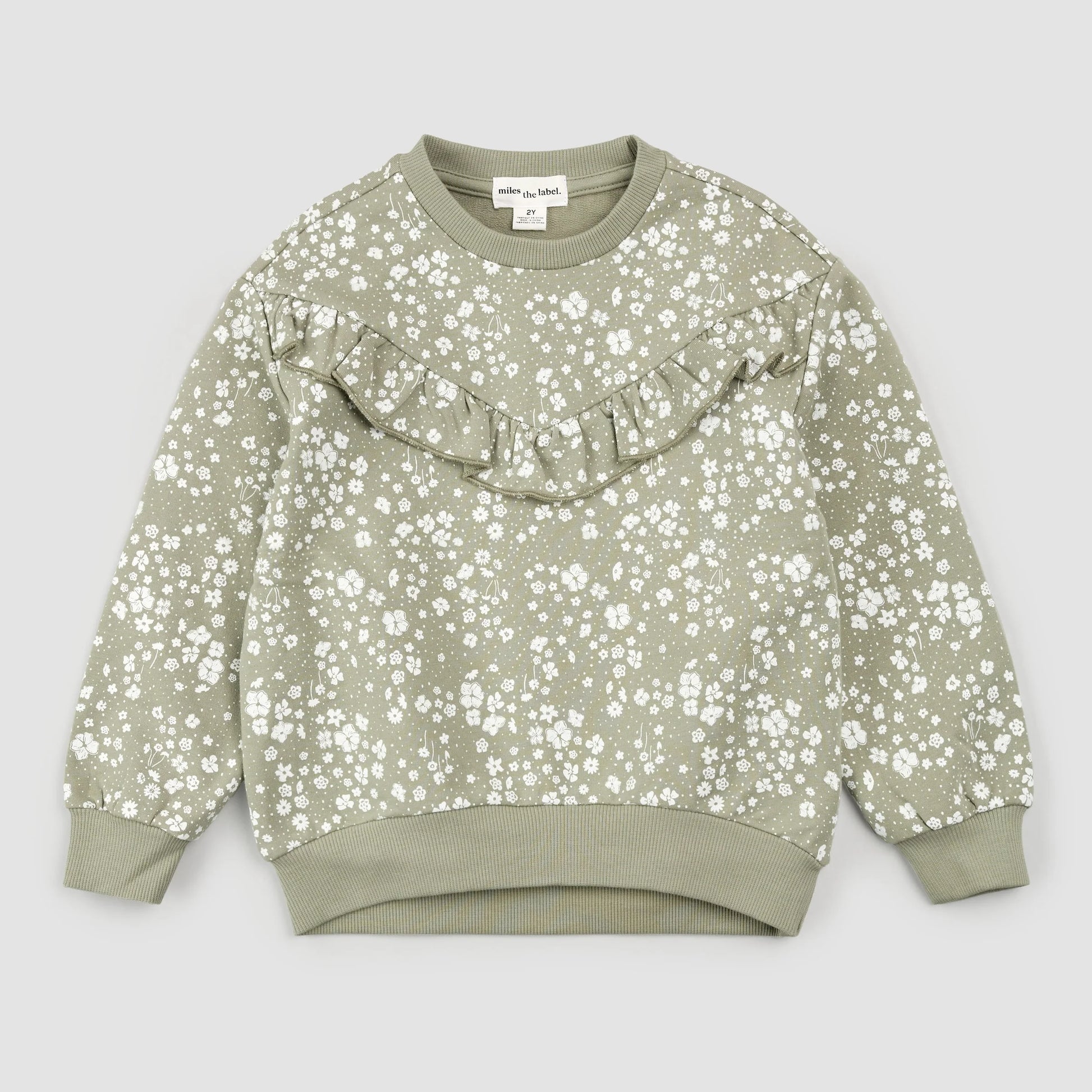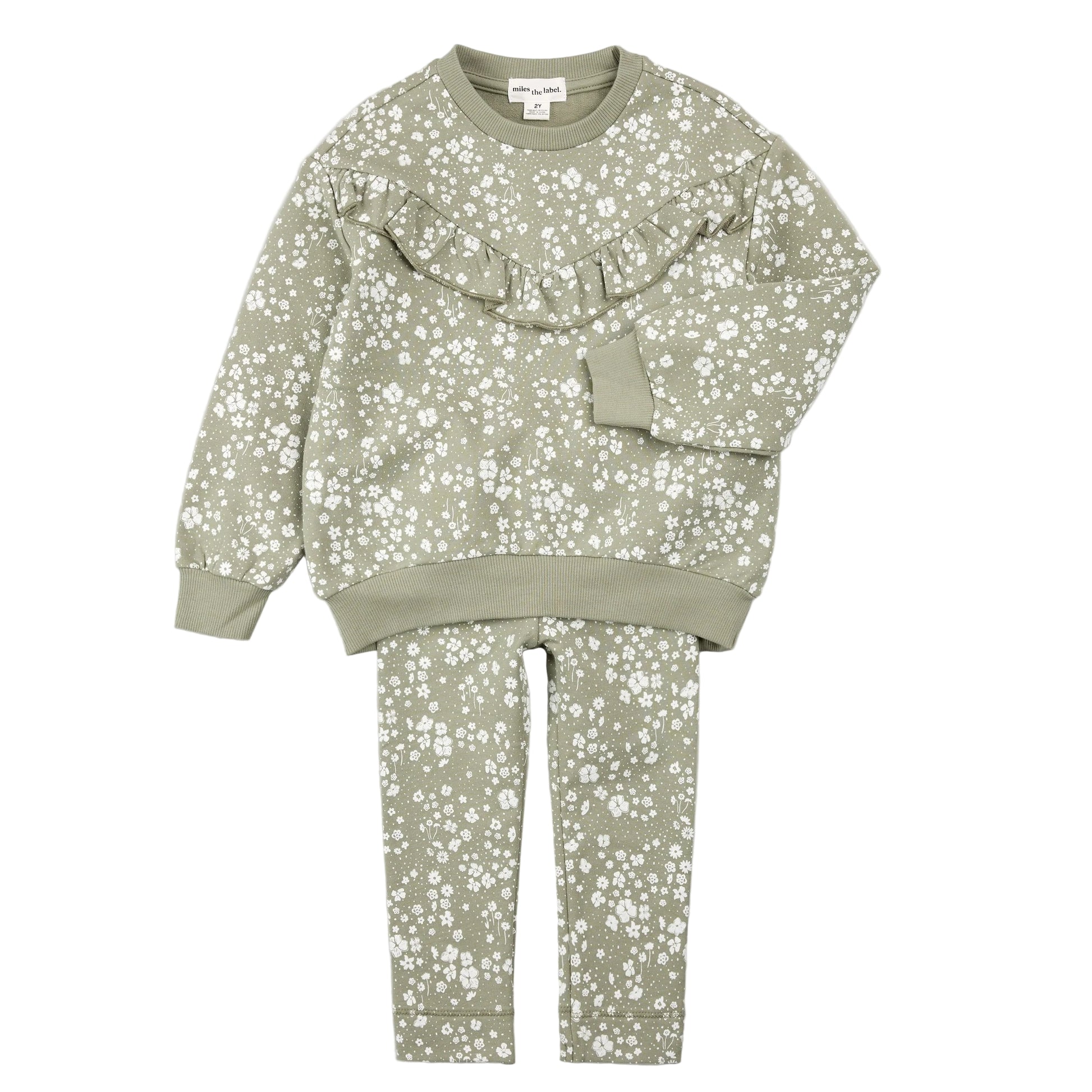 A charming floral set to add a little prettiness into every day. This soft and stretchy set includes sage tones, ruffle details and a ditsy floral print to brighten grey Fall days. With a rounded neckline, and an elasticated waistband on the leggings, she’s all set for comfortable all-day fit. Sweet, stylish, and perfect for playtime.