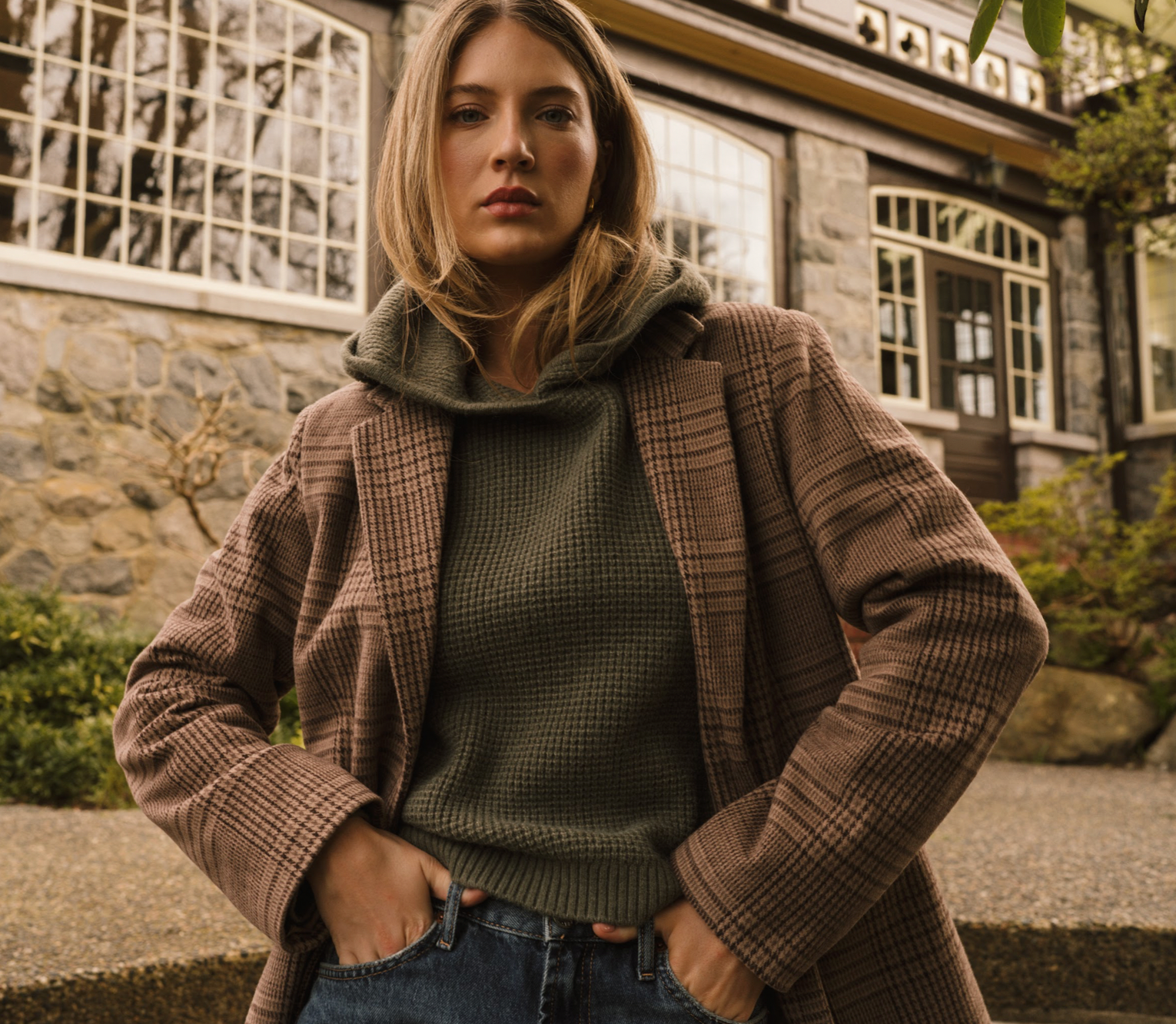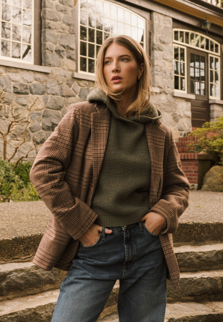 The Sapphira jacket is made of a soft, brushed fabric and is fully lined. Features include a button front closure and patch pockets.