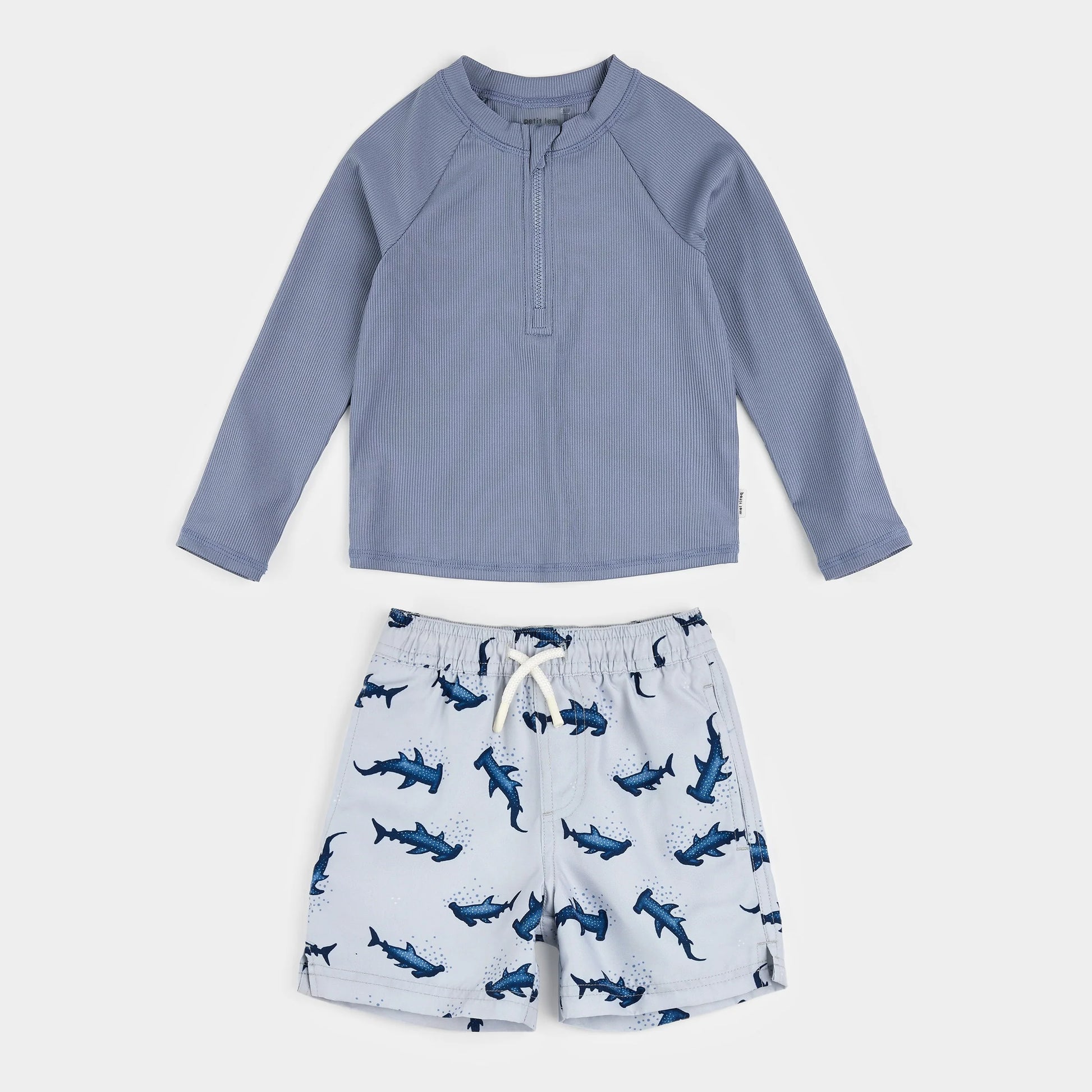 Using calming blues and a cool Hammerhead print, this 2-piece rash guard set is ideal for your shark-obsessed dude. The two-piece set includes a long-sleeved rash guard to keep them warm while protecting their delicate skin from harsh waters, salt and chemicals. A zip down the front ensures the top is easy to remove over his head once the day is one and the shorts simply pull up and down with the elasticated waistband. Made from stretchy, recycled materials with built-in UPF sun protection, the set is kind to little people and the planet.