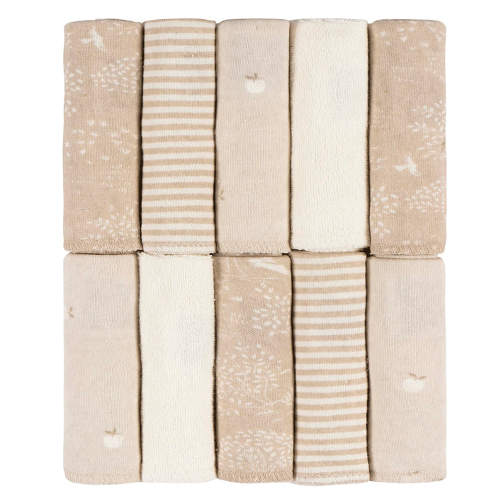 Keep your baby clean and happy with our 10-pack of baby washcloths. Made from soft cotton with plush, absorbent poly knit terry, these washcloths provide a soft touch for cleaning baby. Perfect for bath time, they're also handy to keep in your diaper bag for quick cleanups on the go. Ensure your little one is always fresh and comfy with these essential washcloths!